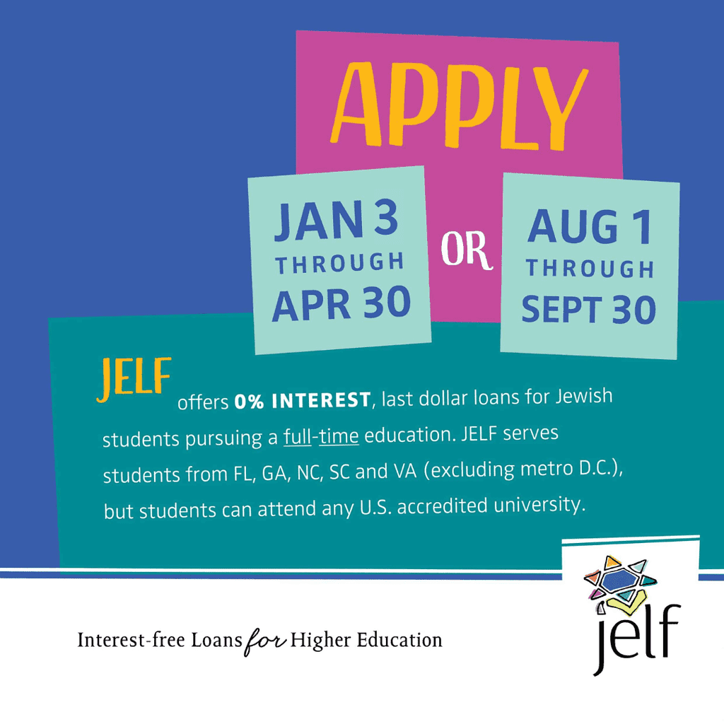 Have you heard of JELF (Jewish Educational Loan Fund)? For 65 years, JELF has provided 0% interest loans to students who are from FL, GA, NC, SC or VA (excluding metro DC) and pursuing higher education at a U.S.-accredited institution of their choice.