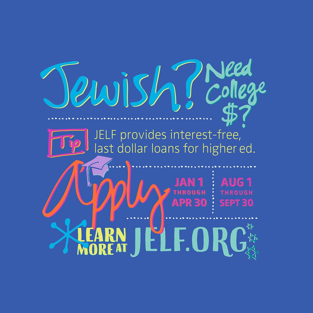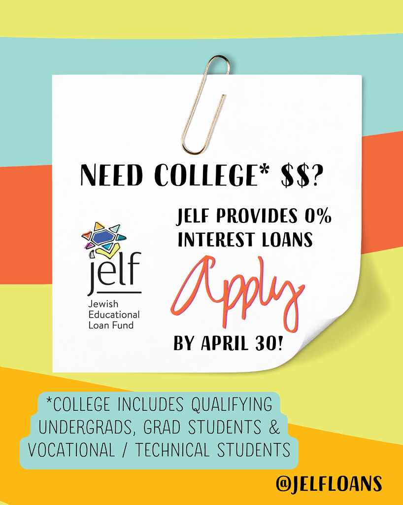 Did you know there’s an organization offering 0% interest, last-dollar loans for Jewish undergrad, graduate, and vocational students with financial need? JELF (Jewish Educational Loan Fund) helps full-time students from FL, GA, NC, SC, or VA (excluding metro DC) attend accredited U.S. schools. Apply by April 30 for the full upcoming academic year or August 1 - September 30 for spring/summer semester(s) at jelf.org/app.